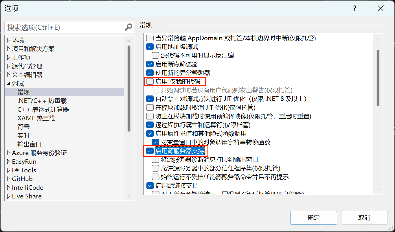 点击顶部菜单栏:工具 -> 选项 -> 调试 -> 常规,取消启用“仅我的代码”